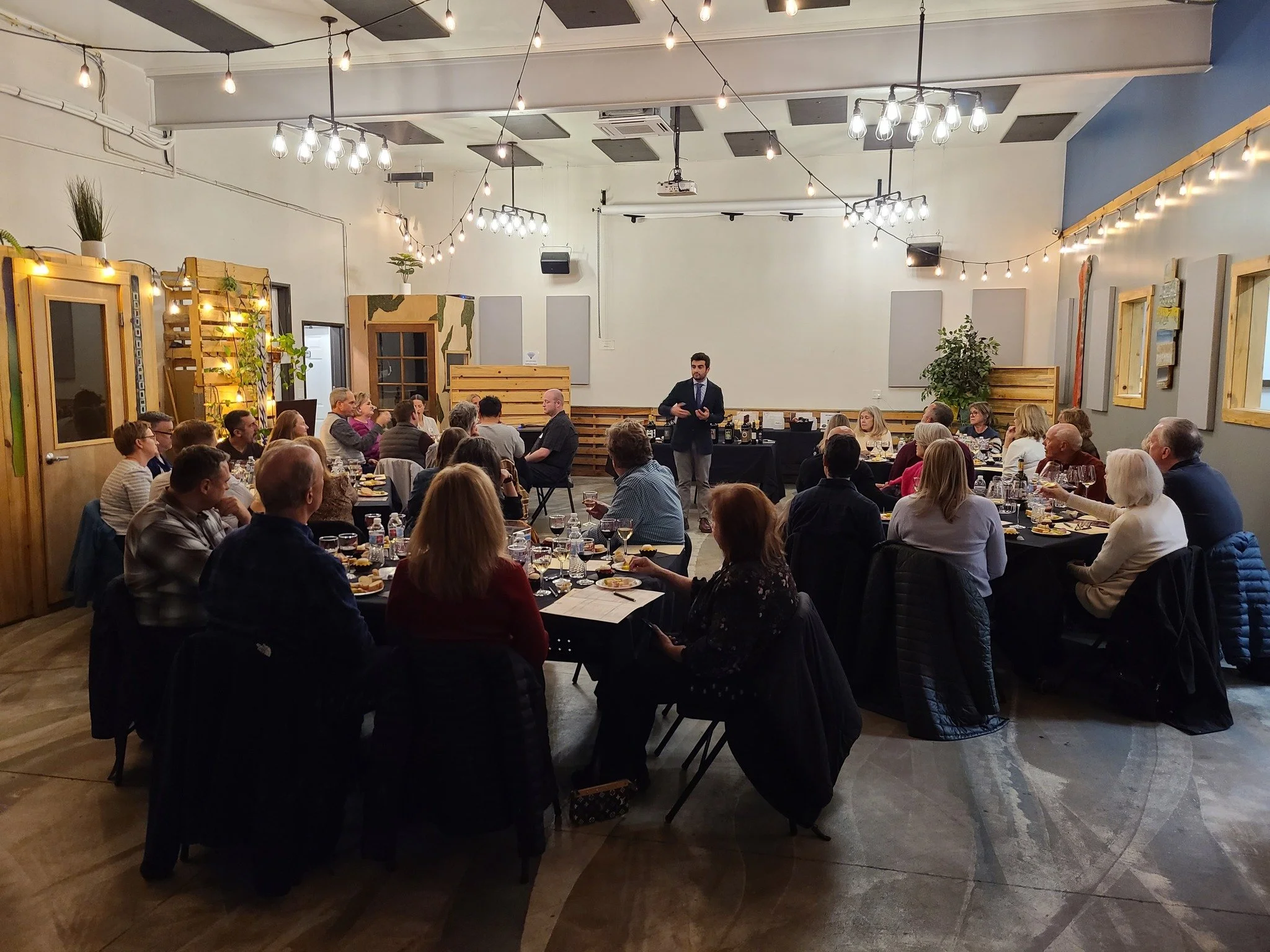 Our beautiful event venue with a large glass garage door is great for larger workshops, office events, and social gatherings for up to 50 guests.
